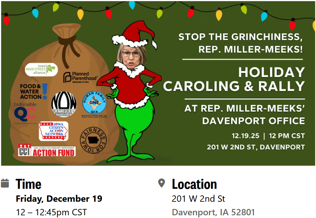 Join us Friday, December 19, at Noon outside Rep. Mariannette Miller-Meeks’ Davenport office (201 W 2nd St, Davenport) for a festive holiday gathering to call out Rep. Miller-Meeks’ year of grinchy behavior! We’ll be outside her office for 30–45 minutes with speakers, caroling, and plenty of holiday spirit as we welcome Rep. Miller-Meeks back to Iowa after a year of downright Grinchy behavior. Bring your favorite Grinch-themed signs and festive attire.