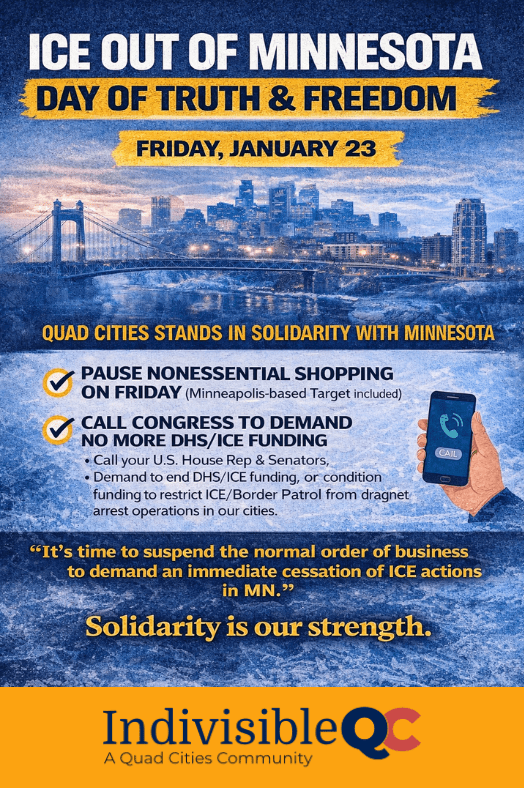 Indivisible Quad Cities and affiliated organizations are encouraging all Quad Citians to support and show solidarity for our besieged neighbors to the north this Friday, January 23, by taking two simple actions: